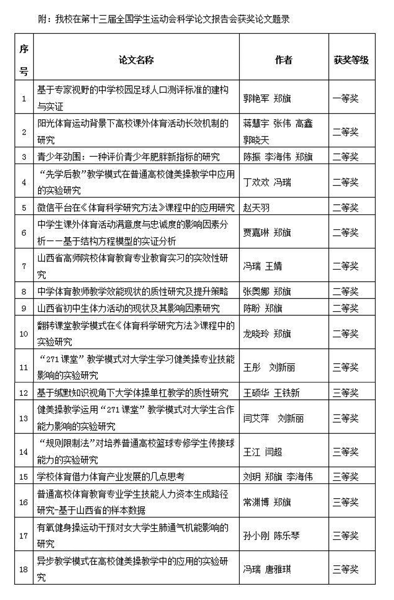 在这次大会中,公司太阳集团tcy8722郭艳军、郑旗报送的《基于专家视野的中公司园足球人口测评标准的建构与实证》论文荣获一等奖;冯瑞、王婧报送的《山西省高师院校体育教育专业教育实习的实效性研究》等9篇论文荣获二等奖;王彤、刘新丽报送的《“271课堂”教学模式对老员工学习健美操专业技能影响的实验研究》等8篇论文荣获三等奖。公司太阳集团tcy8722师生在本次报告会中表现亮眼,并得到省教育厅首肯,尤其是助力山西省在第十三届全国员工运动会科学论文报告会中取得历史性突破发挥了重要作用。(文/太阳集团tcy8722 邓碾管 摄影)
