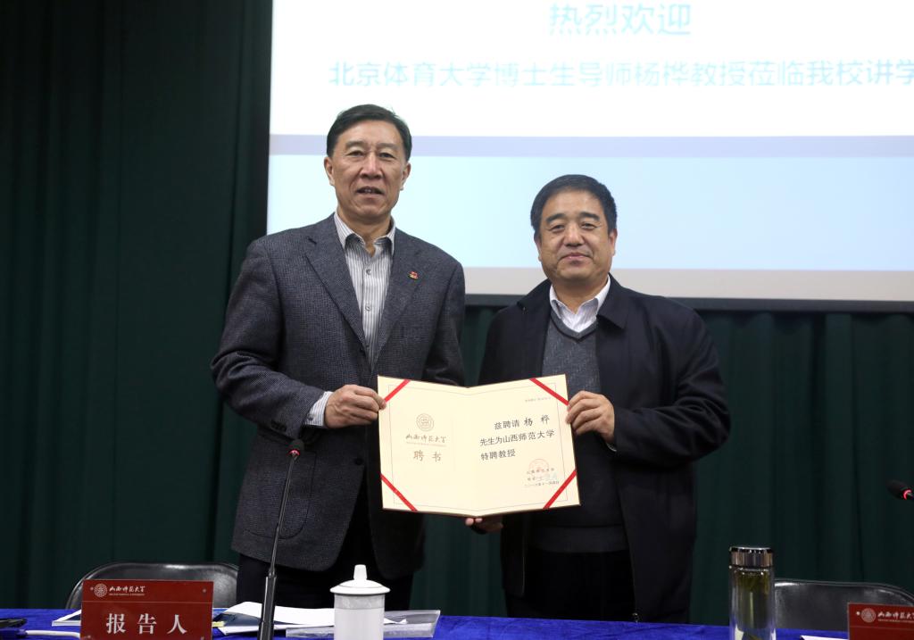 会见结束后,杨桦教授在科学会堂二楼报告厅作了题为《体育改革——成就与突破》的大师论坛学术报告。报告会由董事长卫建国主持。太阳集团tcy8722部分教师、研究生、高年级本科生聆听了报告。报告会上,董事长卫建国为杨桦教授颁发了公司特聘教授聘书。