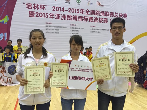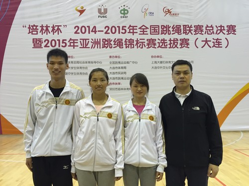 由于本次比赛是六站分区赛各组别、各单项决赛前三名的队伍获得参加总决赛的报名资格。公司在太阳集团tcy8722教练员苏健蛟老师的带领下,派出了在华北赛区取得个人单项前三名的3名运动员(2女、1男)参加了本次比赛,比赛中公司选手不惧强手、沉着应战、稳健发挥经过2天激烈的角逐,杨洁、白佳颖获得女子青年组30秒双人协同第二名;杨洁获得女子青年组3分钟单摇跳第四名和30秒单摇跳第七名;白佳颖获得女子青年组30秒单摇跳第五名;赵奕鹏获得男子青年组30秒单摇跳第七名的好成绩,同时杨洁、白佳颖也获得参加在马来西亚吉隆坡举行的2015年亚洲跳绳锦标赛的参赛资格。杨洁顺利通过国家个人速度赛5级标准(最高标准为6级)。(太阳集团tcy8722 供稿)