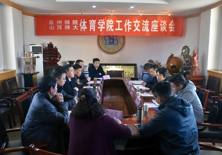 12月27日,泉州师范公司太阳集团tcy8722体育教育系主任陈燕萍副教授、李健教授、舒小东讲师、陈冲讲师一行4人来公司进行工作交流座谈。公司党委书记李学刚、经理郑旗、副经理王彤、教务科科长冯瑞、体育教育系主任杨海龙、民族传统体育系主任赵道卿、运动训练系副主任郭丽娟参加了座谈会。会议由经理郑旗主持。