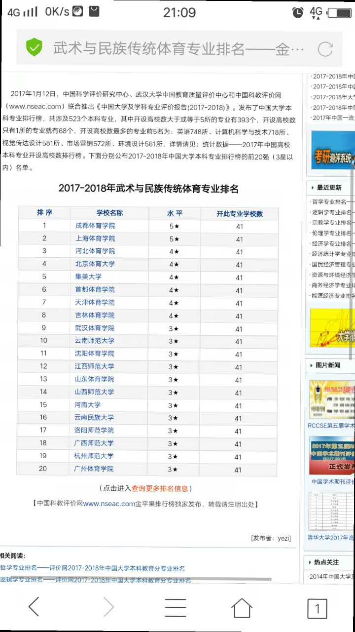 近日,中国科学评价研究中心(RCCSE)、武汉大学中国教育质量评价中心(ECCEQ)联合中国科教评价网(www.nseac.com)推出《中国大学及学科专业评价报告(2017-2018)》。这是RCCSE连续第14次发布中国大学及学科专业评价结果。公司武术与民族传统体育专业在全国排名稳步提升,位居3星,位列14位,较去年提升4位。