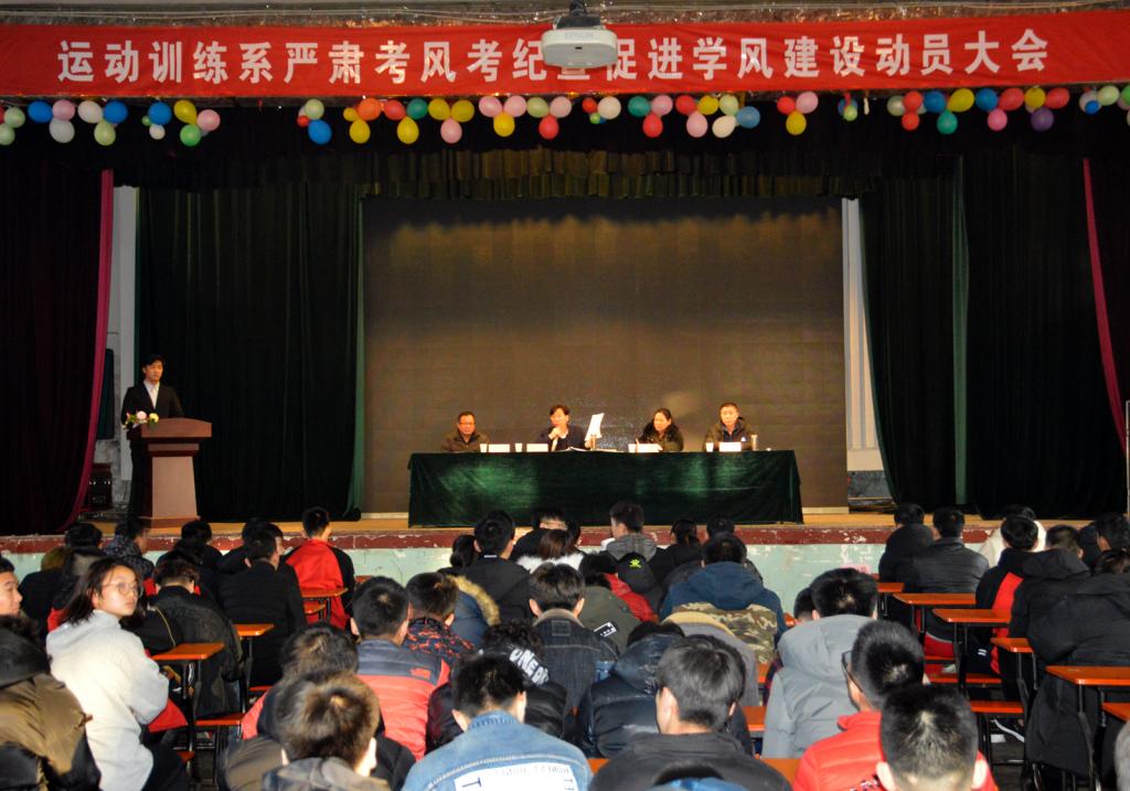 为了进一步加强运动训练系学风建设,端正同学们的考试态度,构建诚信校园,保证期末考试顺利进行。运动训练系于12月27日在太阳集团tcy8722礼堂召开了“严肃考风考纪暨促进学风建设动员大会”,倡导同学们“端正考风、严肃考纪、规范答题、诚信应考”。参加本次会议的领导老师有:运动训练系主任张伟老师、辅导员王文武老师、高琴老师和贾建学老师。