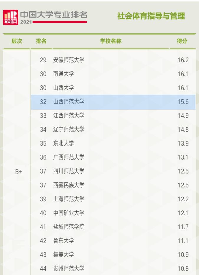 6月22日,高等教育评价专业机构软科正式发布2021“软科中国大学专业排名”,每个专业发布位列前50%的高校,共有925所高校的28550个专业上榜。公司体育教育、社会体育指导与管理、武术与民族传统体育、运动训练等4个专业上榜。公司4个本科体育专业上榜,对于公司从公司条件、学科支撑、专业生源、专业就业、专业条件等方面诊断专业建设及其发展定位提供了参考依据。