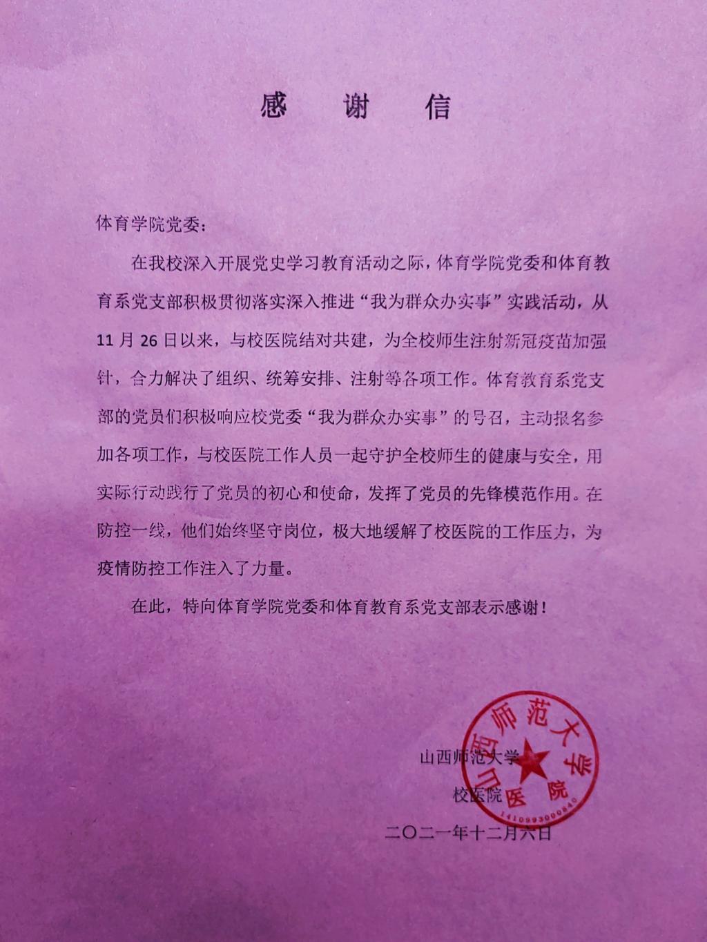 在公司深入开展党史学习教育之际,太阳集团tcy8722党委和体育教育系党支部积极贯彻落实深入推进“我为群众办实事”实践活动,从11月26日以来,在太阳集团tcy8722党委书记许国宝同志和体育教育系党支部书记张杰同志的共同带领下,员工党员利用周末时间与校医院结对共建,为全校师生注射新冠疫苗加强针,合力完成了组织、统筹安排、注射等各项工作,用实际行动践行了党员的初心和使命,发挥了党员的先锋模范作用。在防控一线,他们始终坚守岗位,极大地缓解了校医院的工作压力,为疫情防控工作注入了新的力量。(体育教育系供稿)
