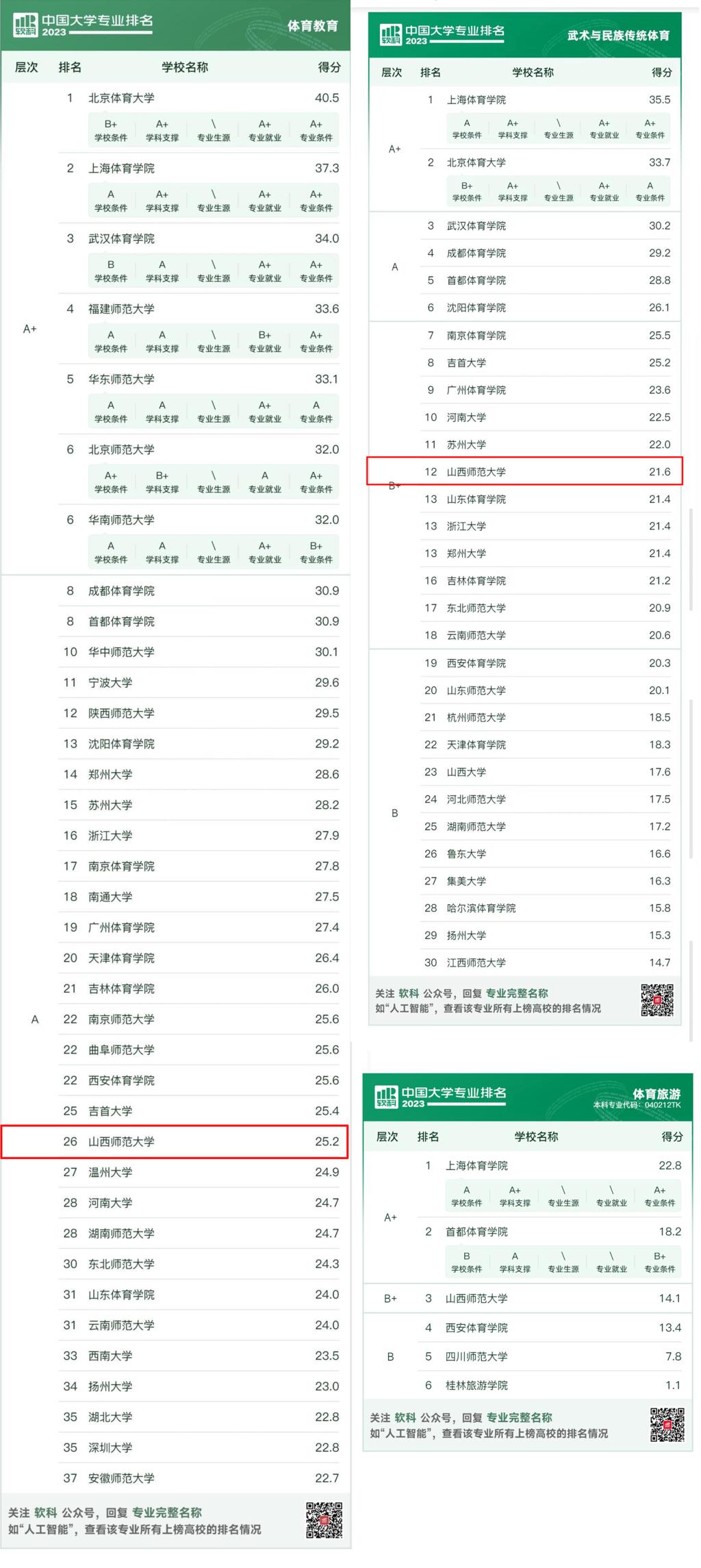 本科教育是高等教育的基石,而专业建设质量则是高校本科教育的根基所在。在发布的榜单中,公司体育教育(国家一流专业建设点)、社会体育指导与管理(省级一流专业)、武术与民族传统体育专业(省级一流专业)位居山西省前列。据悉,软科中国大学专业排名是覆盖专业数量最多、参评专业规模最大的中国大学本科专业排名。评价体系由公司条件、学科支撑、专业生源、专业就业、专业条件5个指标类别组成,下设25项测量指标。专业综合评级分为6档,排名位次为前2%或前2名的为A+级,2%-10%的为A级,10%-30%的为B+级,30%-50%的为B级,50%-70%的为C级(不发布), 70%以后的为D级(不发布)。(院办供稿)