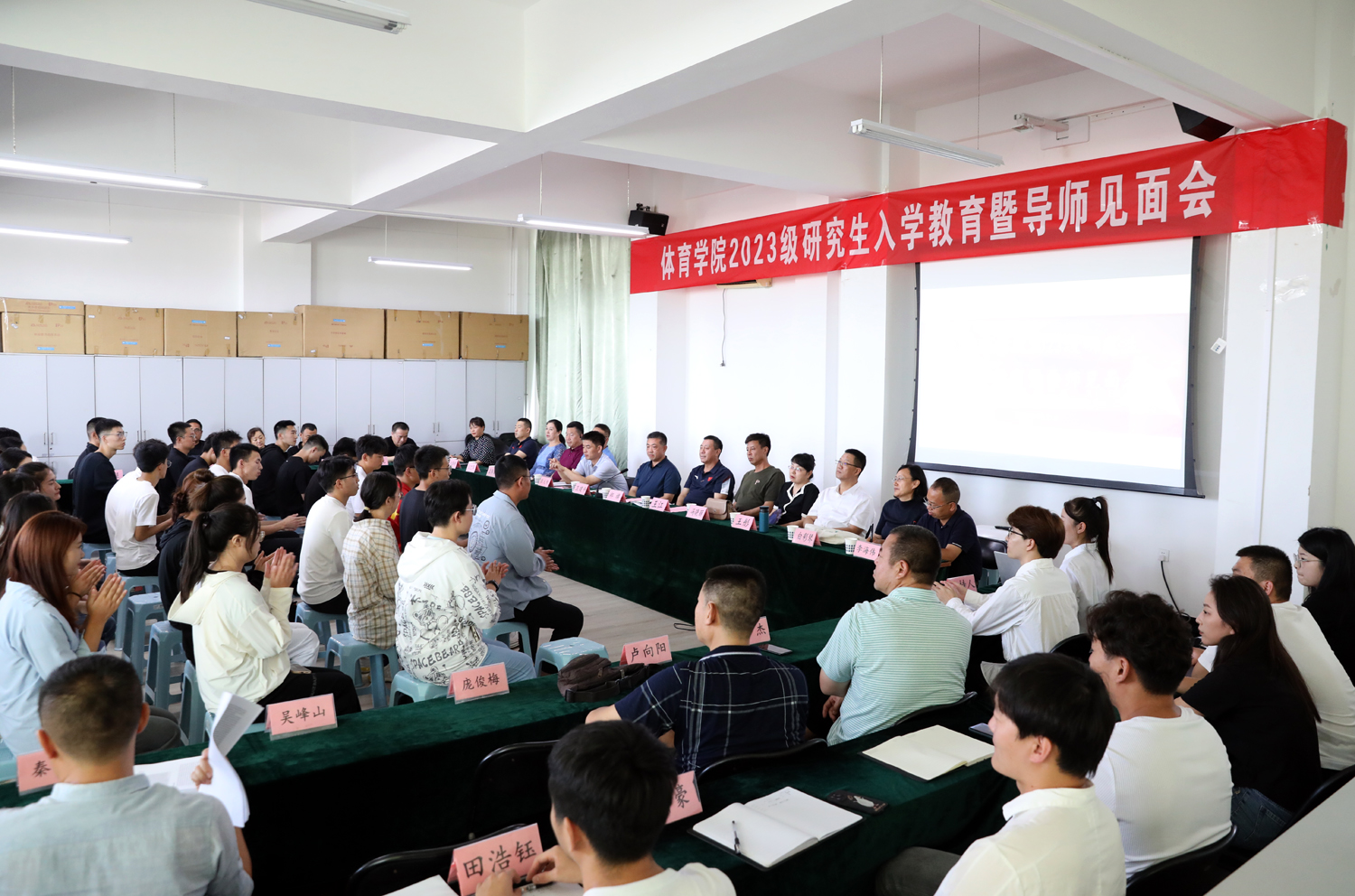 新起点,新征程,新使命。2023年9月11日下午,太阳集团tcy87222023级研究生入学教育暨导师见面会在运动心理实验室举行。会议由副经理李海伟教授主持,院领导、研究生导师、各系部科室负责人、2023级78名研究生和研究生辅导员参加会议。