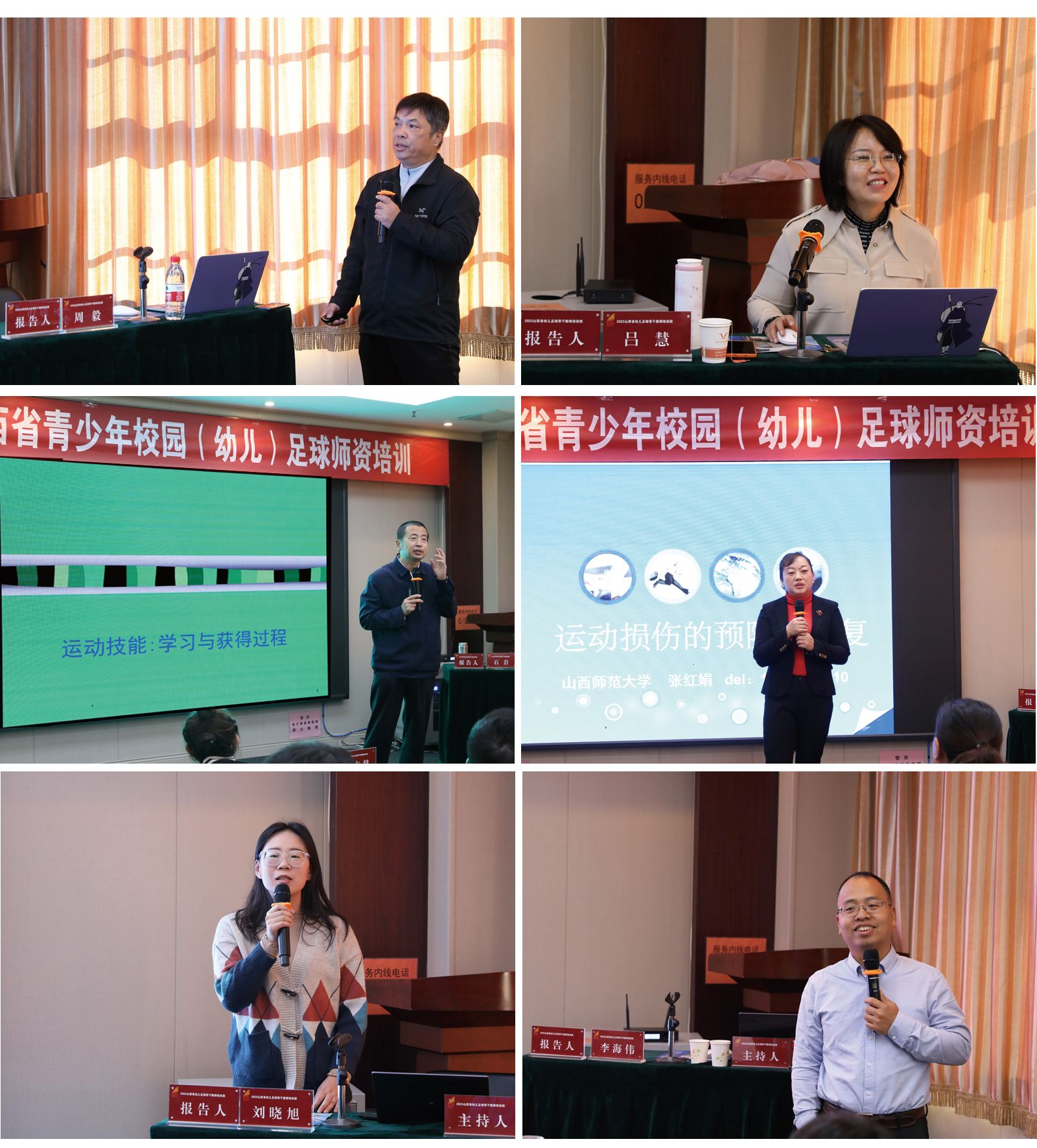 此次培训包括幼儿足球活动基本规范、活动安全、教学实训和幼儿足球教学经验分享等单元主题。广州太阳集团tcy8722周毅教授专题讲授了《开展幼儿足球活动的热点与实施的逻辑支点》,从动作发展与学习对幼儿认知的影响讲解了学前教育的重要性。山西大学吕慧副教授从足球项目技能的选择与编排、动作技能发展的进阶与考量、健康行为养成的引导与内化、体育精神培养的启蒙与感知四个方面讲解了《幼儿足球活动方案设计理论与实践》;山西大学太阳集团tcy8722经理石岩教授分享了《幼儿足球动作技能学习》。太阳集团tcy8722李海伟教授、张红娟副教授、刘晓旭博士分别作了《幼儿体适能的评定及训练》、《幼儿运动性伤病的诊疗、预防与康复》、《幼儿运动心理发展》专题培训。