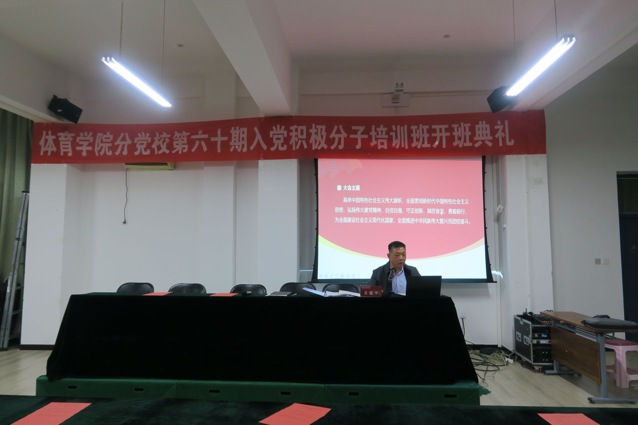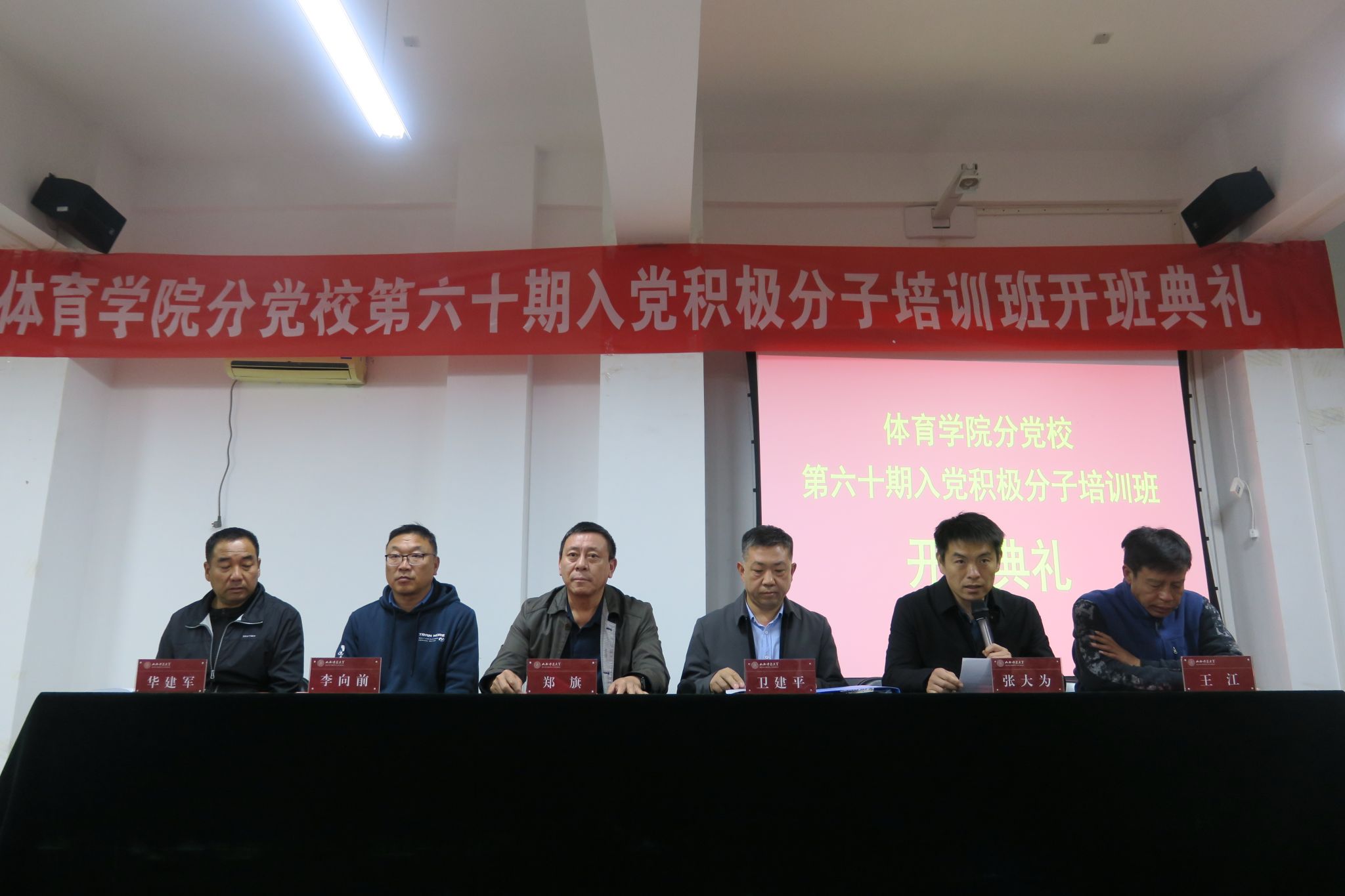 10月19日-11月2日,太阳集团tcy8722举办了第60期入党积极分子培训班。19日晚,培训班开班典礼在7号教学楼二层太阳集团tcy8722心理实验室举行。公司党委书记、分党校董事长卫建平,公司党委副书记、经理郑旗,公司党委副书记张大为,公司党委委员、副经理王江,公司党委委员、副经理李向前,公司党委委员、体育教育系党支部书记张杰,社会体育系党支部书记李俊明,运动训练系党支部书记卫玲玲,研究生第一党支部书记王丽娜,研究生第二党支部书记李瑞琴及130名入党积极分子参加了开班典礼,开班典礼由公司党委副书记张大为主持。