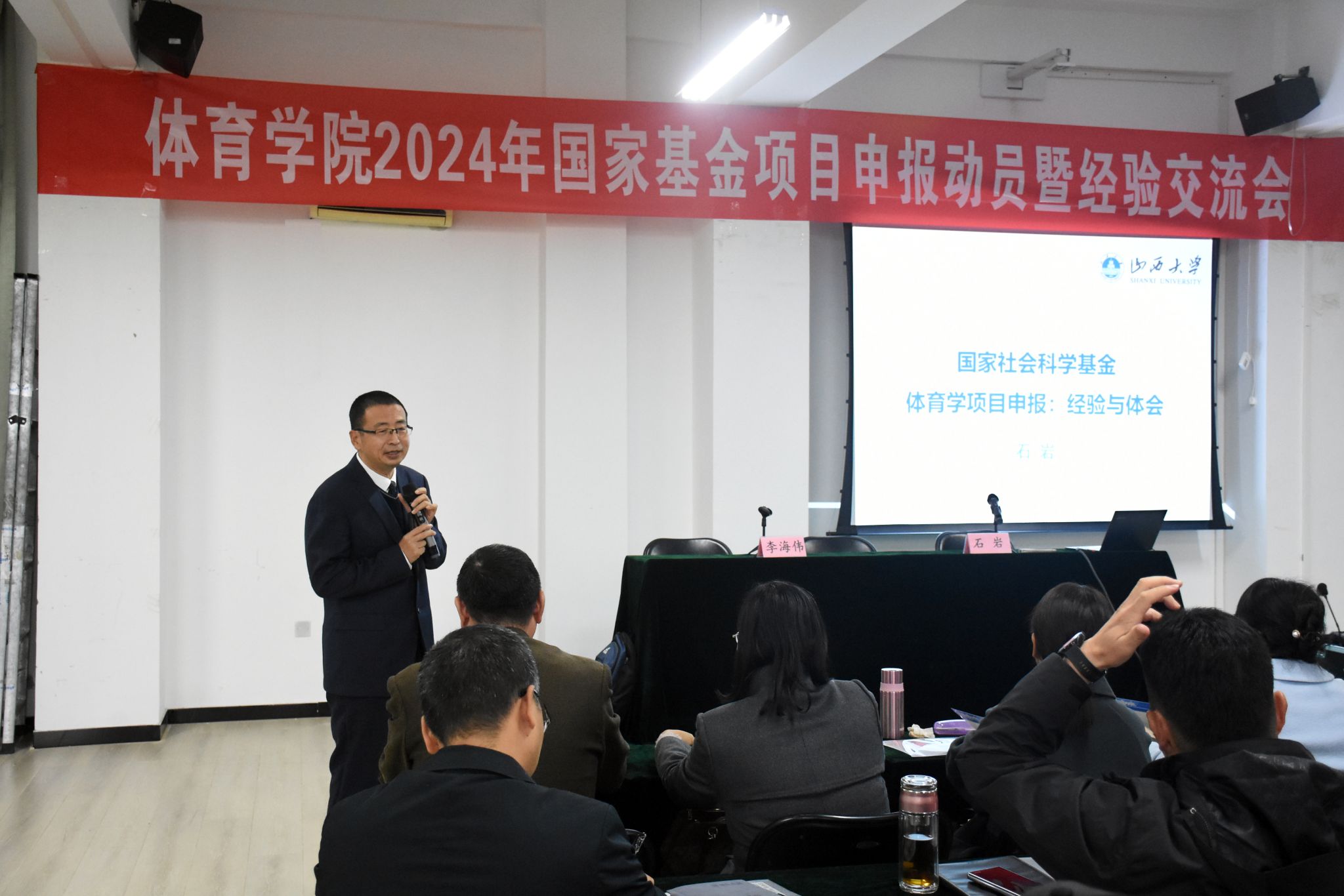 11月15日下午,太阳集团tcy87222024年国家基金项目申报动员暨经验交流会在体育心理实验室召开,会议邀请山西大学太阳集团tcy8722经理石岩教授进行了申报经验交流。