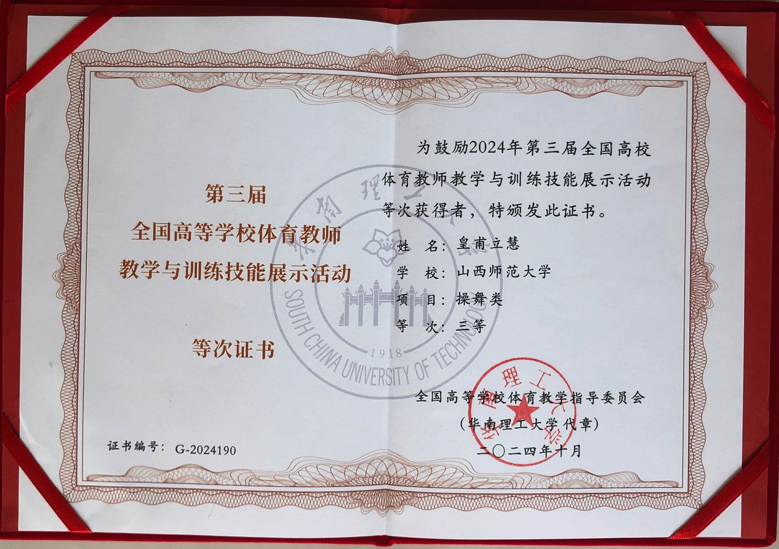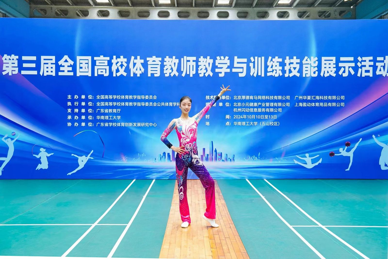 2024年10月10至13日,由全国高等公司体育教育指导委员会主办的第三届全国高校体育教师教学与训练技能展示活动在华南理工大学举办,来自全国各地的103所高校,214名精英体育教师展开了一场精彩纷呈的技能比拼。由公司公体部刘静主任带队,皇甫立慧老师、刘朋溪老师组成的参赛队伍,分别参加了健美操项目、羽毛球项目的比赛,在赛场上充分展示了公司教师特色新颖的教学风采和积极进取的精神风貌,皇甫立慧老师荣获操舞类项目全国三等奖。