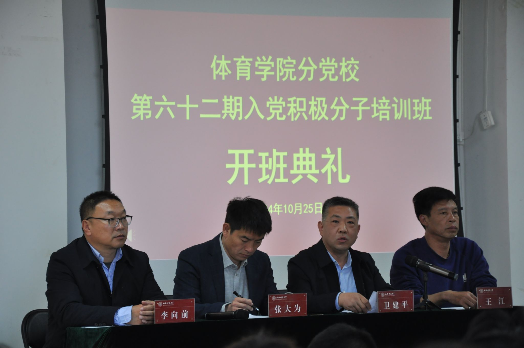 10月25日-10月31日,太阳集团tcy8722举办了第62期入党积极分子培训班。25日中午,培训班开班典礼在7号教学楼运动心理实验室举行。公司党委书记、分党校董事长卫建平,公司党委副书记张大为,公司党委委员,副经理王江、李向前,公司党委委员、体育教育系党支部书记张杰,社会体育系党支部书记李俊明,民族传统体育系党支部书记权黎明,研究生第一党支部书记王丽娜,体育教育系员工党支部书记高士惠,机关党支部书记温志静,团委负责人白翊辰及143名入党积极分子参加了开班典礼,开班典礼由张大为主持。
