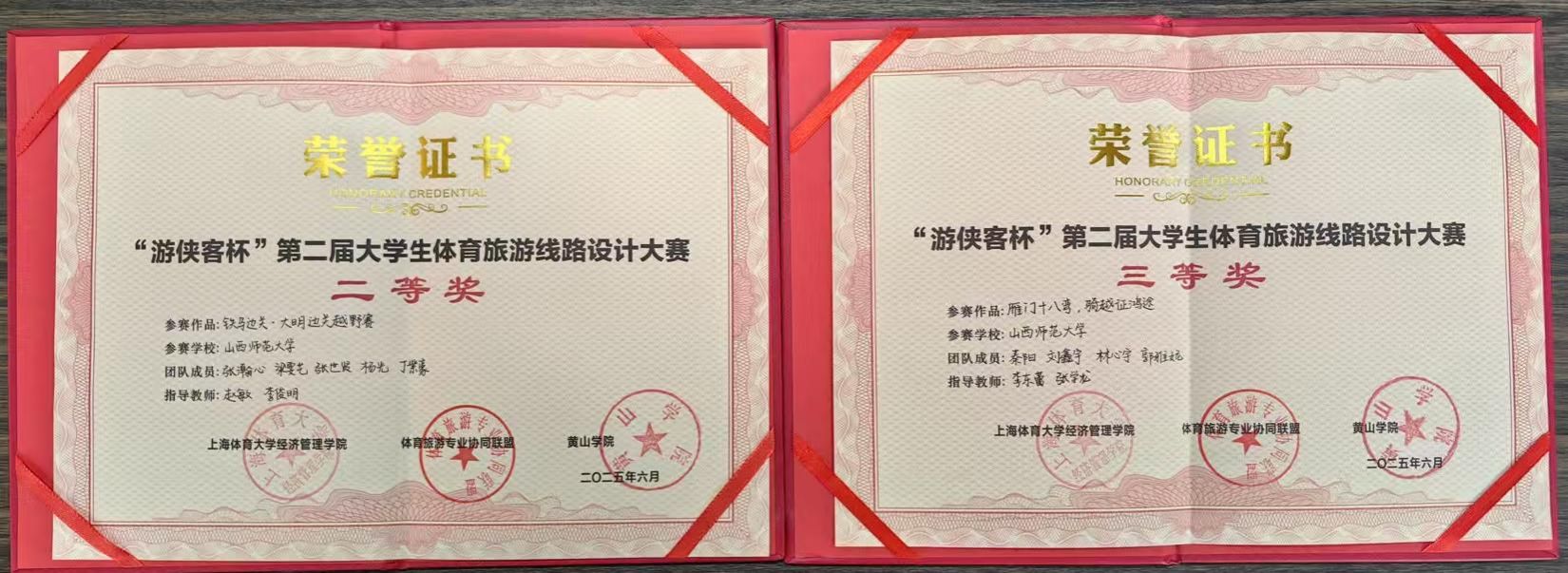 2025年6月4日,"游侠客杯"第二届老员工体育旅游线路设计大赛决赛在安徽省黄山市圆满落幕。公司太阳集团tcy8722体育旅游专业和社会体育指导与管理专业7名同学在李俊明和李东蕾老师带领下参赛,分别凭借作品《铁马边关·大明边关越野赛》和《雁门十八弯·骑征越鸿途》荣获大赛二、三等奖。