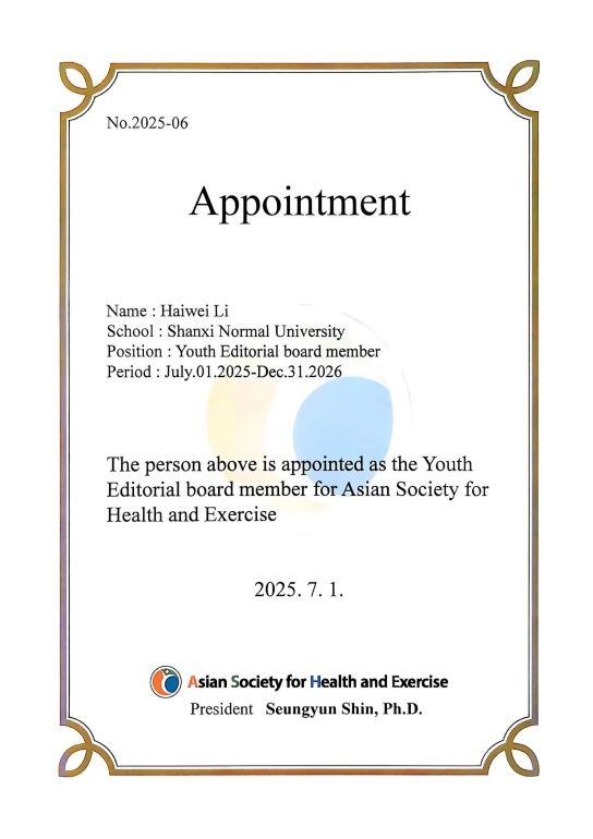 开幕式上,亚洲健康与运动学会为六位青年学者颁发期刊青年编委聘书,李海伟老师位列其中。在主旨报告环节,来自日本筑波大学、中国武汉太阳集团tcy8722、韩国企业及高校的专家分别就老龄化健康政策、VR太极拳应用、中枢神经疾病防治和计算机视觉辅助射箭等主题进行报告,呈现了跨学科融合的新趋势。