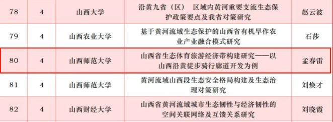 近日,根据山西省哲学社至公室公示的2025年度山西省哲学社会科学规划课题经济专项(智库类别)拟立项名单,经专家评审、会议研究等程序,孟春雷教授申报的“山西省生态体育旅游经济带构建研究—以山西沿黄河徒步骑行廊道开发为例”获得立项公示。