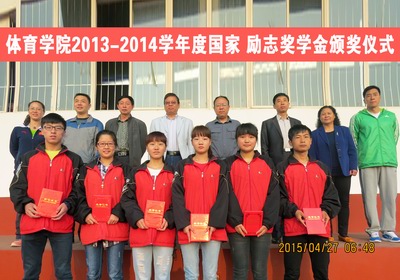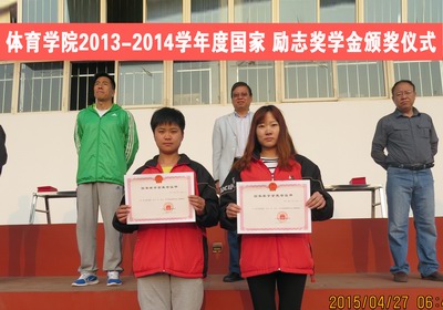 在升国旗仪式后,首先由公司党委副书记段东升为国家奖学金获得者体教1102班郭娜、社体1101班王婧两名同学颁发了证书。随后,院系领导分别为47名国家励志奖学金获得者颁发了证书。
