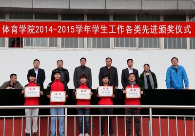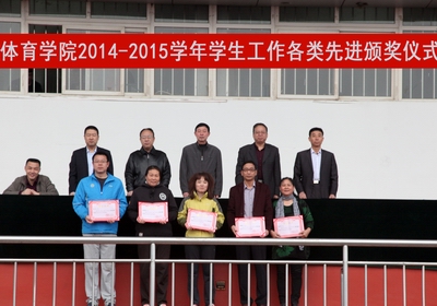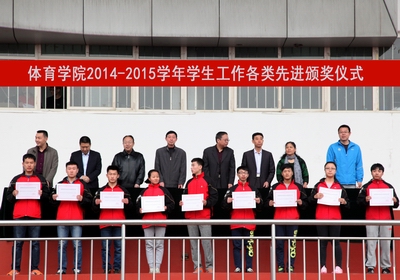 2016年3月21日早七点太阳集团tcy8722在田径场举办了2014-2015学年员工工作各类先进的颁奖仪式。颁奖的领导老师有:公司党委副书记段东升、体育教育系主任杨海龙、副主任张杰、武术与民族传统体育系主任赵道卿、副主任权黎明、体育教育二系主任吴峰山、场馆科科长高琴、社会体育系副主任杜志华。