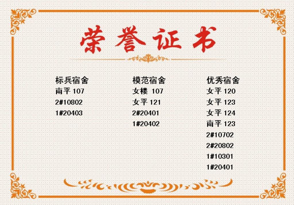 经过认真评选,南平107、2#10802、1#20403等13个宿舍分别被评为标兵宿舍、模范宿舍和优秀宿舍。 (运动训练系供稿)