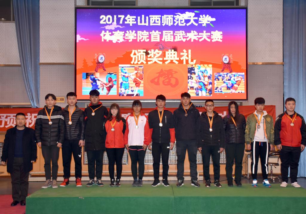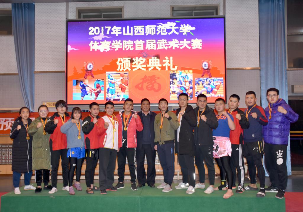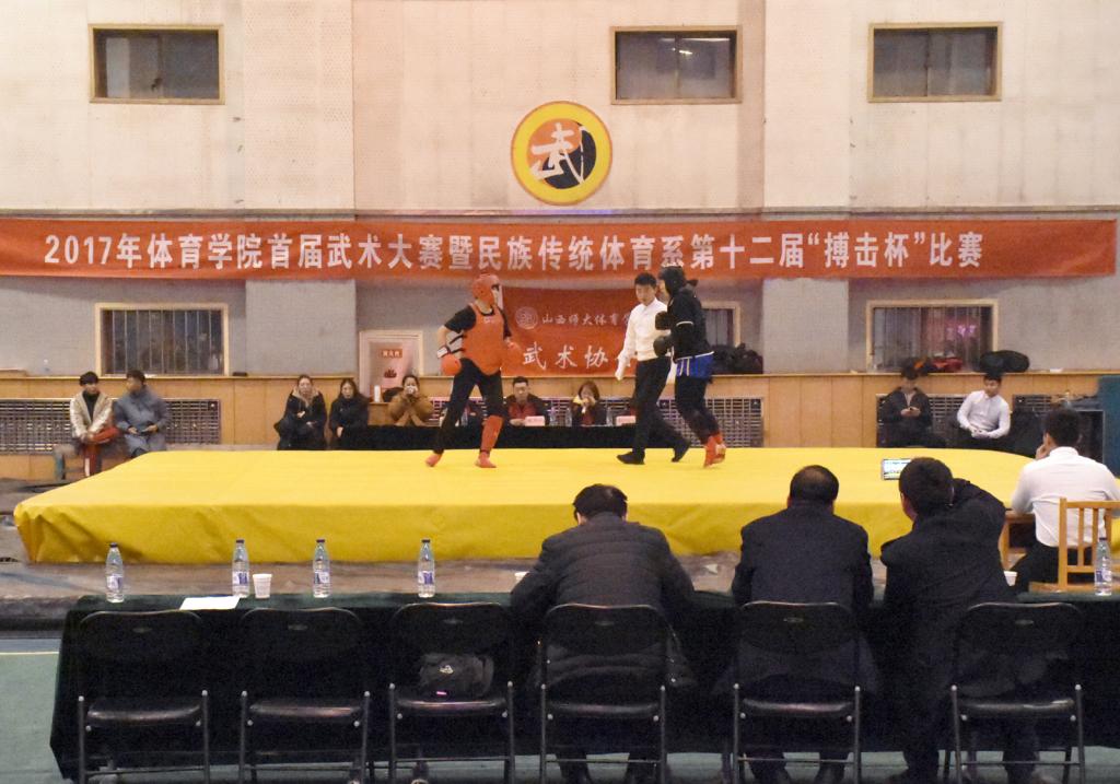 12月13日晚19:00,武术套路比赛拉开帷幕。武术套路分为长拳、南拳、太极、形意、传统一类拳、传统二类拳、自选刀、自选剑、自选长器、太极剑等十三个比赛项目。赛场上武术健儿们斗志昂扬,动作连贯行云流水,引来了观众的阵阵喝彩与掌声。武术散打大赛设有男女两个组别(其中女子52kg、56kg、60kg、60+kg;男子55kg、60kg、65kg、70kg、75kg、80kg、85kg、90kg、95kg、95+kg)。比赛过程中选手们思维冷静,身手敏捷,击打部位准确,点到即止,尽显文明尚武风范。大赛于12月21日圆满落幕。最终体育教育系、体育教育二系、民族传统体育系、运动训练系、社会体育系代表队获得了体育道德风尚奖。闫泽军、穆治光、杨松林等十三名同学获得了武术套路各单项冠军。于铭睿、常宇鹏、裴超磊等十三名同学获得了武术套路各单项亚军。高瑞鹏、王伟诚、柳旭东等十四名同学获得武术散打冠军。张厚毅、刘振彪、王涛等十四名同学获得武术散打亚军。出席决赛的领导老师为所有获奖团体和选手颁奖。