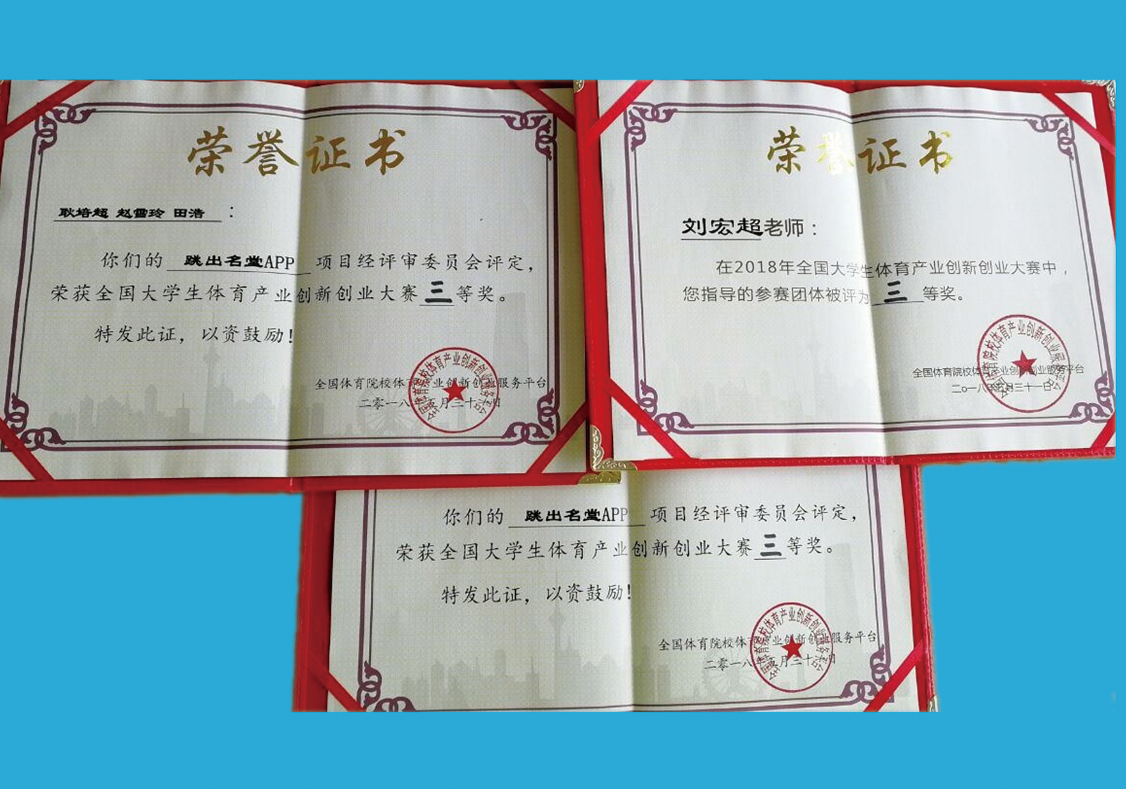 5月28日至31日,由全国体育院校体育产业创新创业服务平台主办、天津太阳集团tcy8722承办、国家体育总局科教司、天津市教育委员会、天津市体育局指导的2018年全国老员工体育产业创新创业大赛在天津太阳集团tcy8722隆重举行。太阳集团tcy8722团委积极组织,经过前期线上线下宣传、报名和全国评选,社会体育系1501班的耿培超、田浩等同学的参赛项目《跳出名堂APP》(指导教师刘宏超)进入了全国复决赛。由院团委副书记程祖浩带队代表太阳集团tcy8722参赛,经过激烈的角逐和严格评选,项目荣获了全国老员工体育产业创新创业大赛三等奖,实现了新的突破。