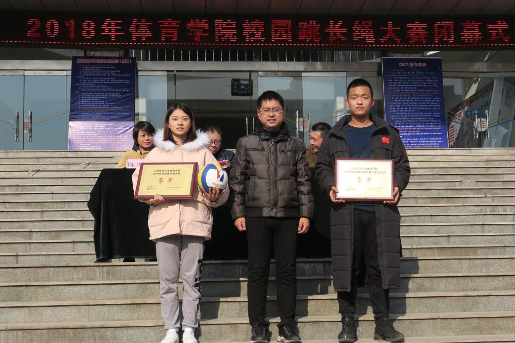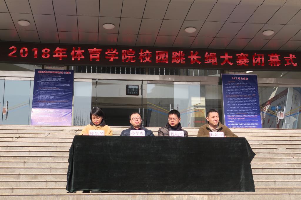 12月14日中午12:30,由院团委员工会主办,社团联合会、社会体育系员工会承办,田径协会协办的2018年校园跳长绳大赛在教学楼前举行闭幕式。公司党委副书记孙学虎,院团委副书记程祖浩,社会体育系主任陈乐琴及社会体育系副主任杜治华出席闭幕式,各班、院系员工会代表队和裁判员100余人参加了闭幕式。
