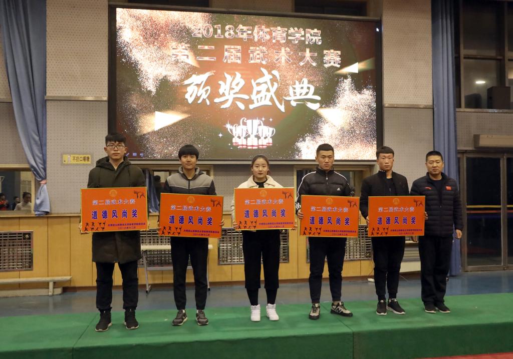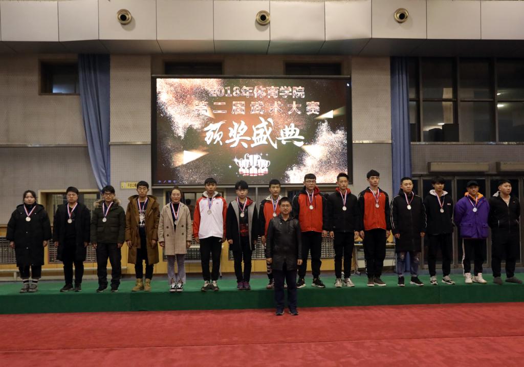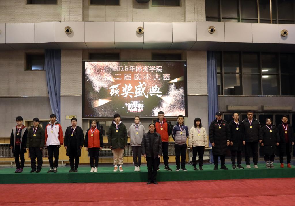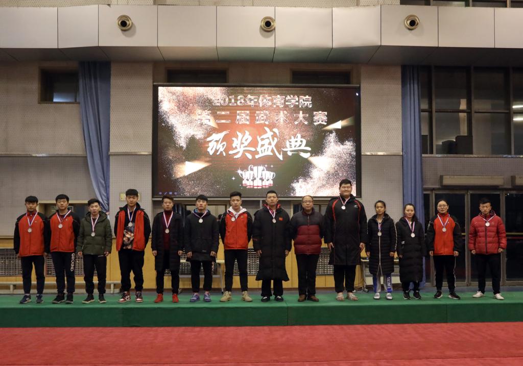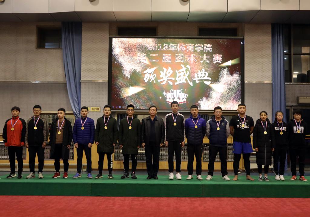 本次比赛裁判员们严格遵守《裁判员守则》,认真履行工作职责不辞劳苦,公正裁判。全体运动员自觉遵守比赛章程,听从指挥,服从裁判,赛出风格,赛出水平。最终,周友宝、张文帅、崔丹阳、郝尤尤、姜亚兰等13人获得武术散打竞赛冠军;石腾飞、张智超、王大伟、马有为等15人获得武术套路竞赛冠军;马凯丽、于任游、肖新雨、赵远东等14人获得了武术套路竞赛亚军。贾惠明、石杰、王小宇、宋伟刚等13人获得武术散打竞赛亚军。民族传统体育系、体育教育系、运动训练系、社会体育系、体育教育二系获得了体育道德风尚奖。出席决赛的领导老师为所有获奖团体和选手颁奖。