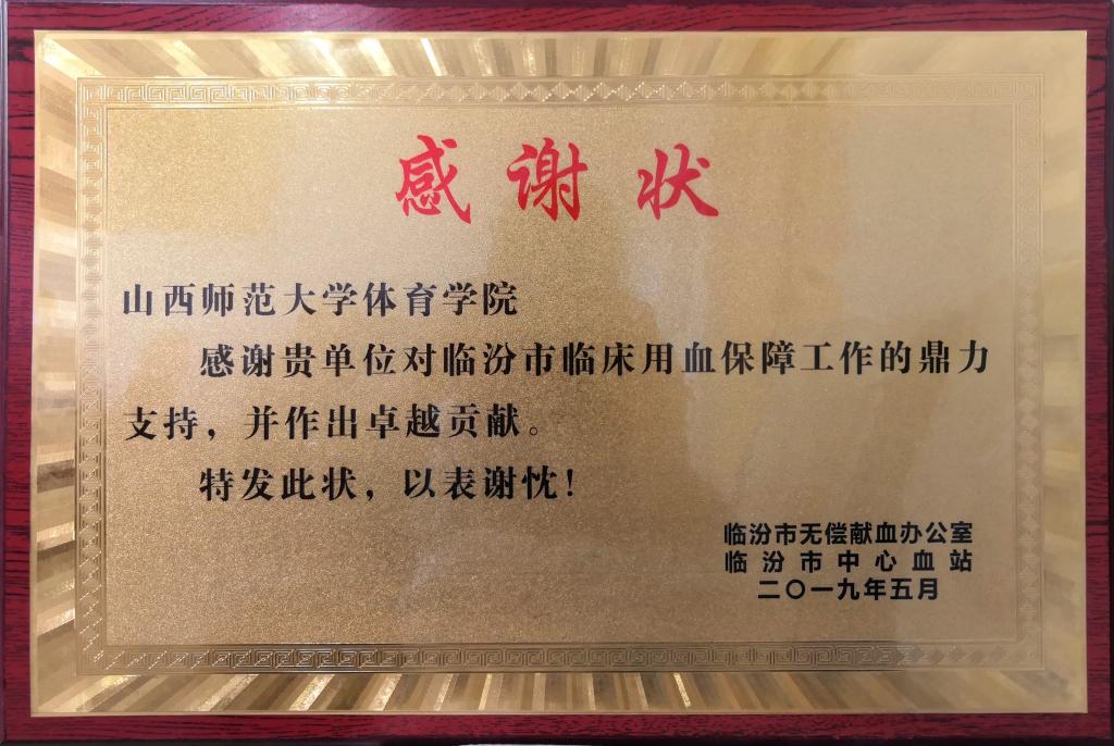 活动结束后,为了感谢公司师生一直以来热心参与无偿献血这项公益事业,临汾市无偿献血办公室、临汾市中心血站为公司颁发了“感谢状”,感谢公司对临汾市临床用血保障工作的鼎力支持,并作出卓越贡献。(院团委供稿)