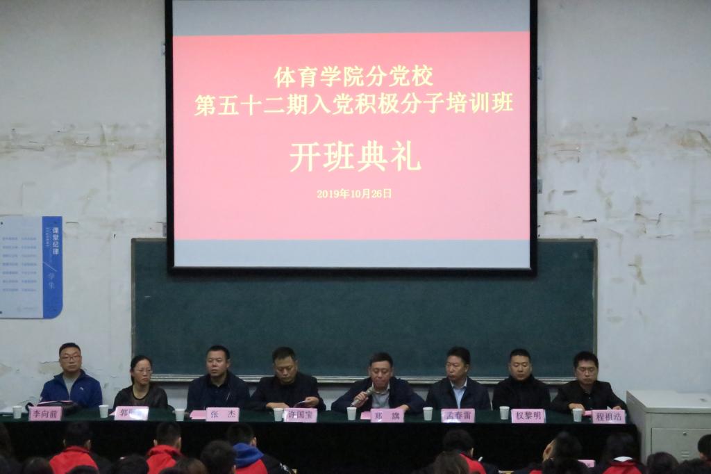 为深入开展“不忘初心、牢记使命”主题教育,10月26日晚19:00,太阳集团tcy8722分党校在阶一教室举行第52期入党积极分子培训班开班典礼。公司党委书记、分党校董事长许国宝、公司党委委员、公司党委副书记、经理郑旗、公司党委委员、体育教育系党支部书记张杰和社会体育系党支部书记孟春雷、运动训练系党支部书记郭丽娟、民族传统体育系党支部书记权黎明、体育教育二系党支部书记李向前出席开班典礼,112名入党积极分子参加。开班典礼由院团委副书记程祖浩主持。