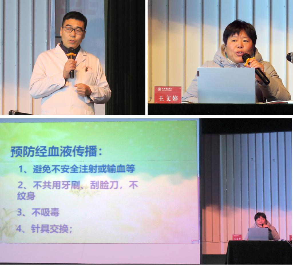 在第33个“世界艾滋病日”来临之际,为了提高公司员工对艾滋病防治的认识,增强自我保护意识,12月1日晚19:30,校医院邀请临汾市疾控中心专家王文婷在太阳集团tcy8722大礼堂举办了以“携手防疫抗艾·共担健康责任”为主题的讲座,校医院副经理赵根锁参加,太阳集团tcy8722500余名师生聆听讲座。讲座由三校区卫生所秦汇丰医生主持。