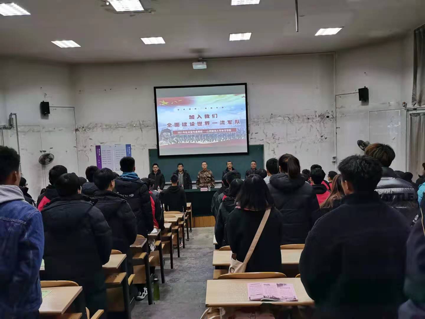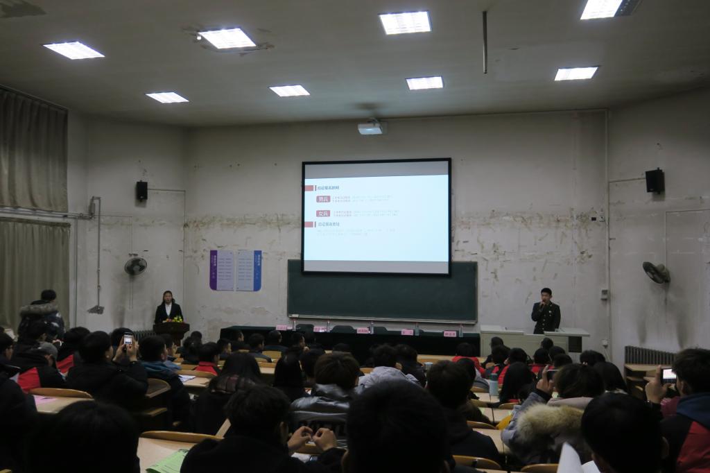 为进一步推进老员工应征入伍工作,帮助老员工了解、掌握应征入伍的相关政策和流程,鼓励员工献身国防事业。12月17日晚19:00,由太阳集团tcy8722武装部、太阳集团tcy8722团委主办,太阳集团tcy8722员工社团联合会、国防军事拓展协会、太阳集团tcy8722网络攻防支援排承办的“参军报国,无上光荣”2021年太阳集团tcy8722征兵宣讲会在阶一教室,尧都区西街办事处武装部部长郭利林、校武装部军事教研室主任李文、武装部专干任金虎、三校区保卫科科长郝宝喜、院团委副书记程祖浩参加,120余名同学聆听了宣讲会。