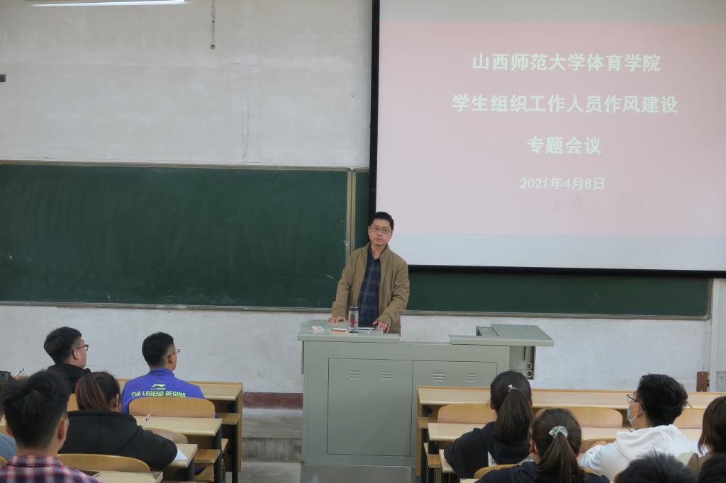 为加强员工组织工作人员作风建设,院团委于4月8日中午12:30在阶梯二教室召开了作风建设专题会议。院团委副书记程祖浩老师讲话,员工组织工作人员代表50余人参加。