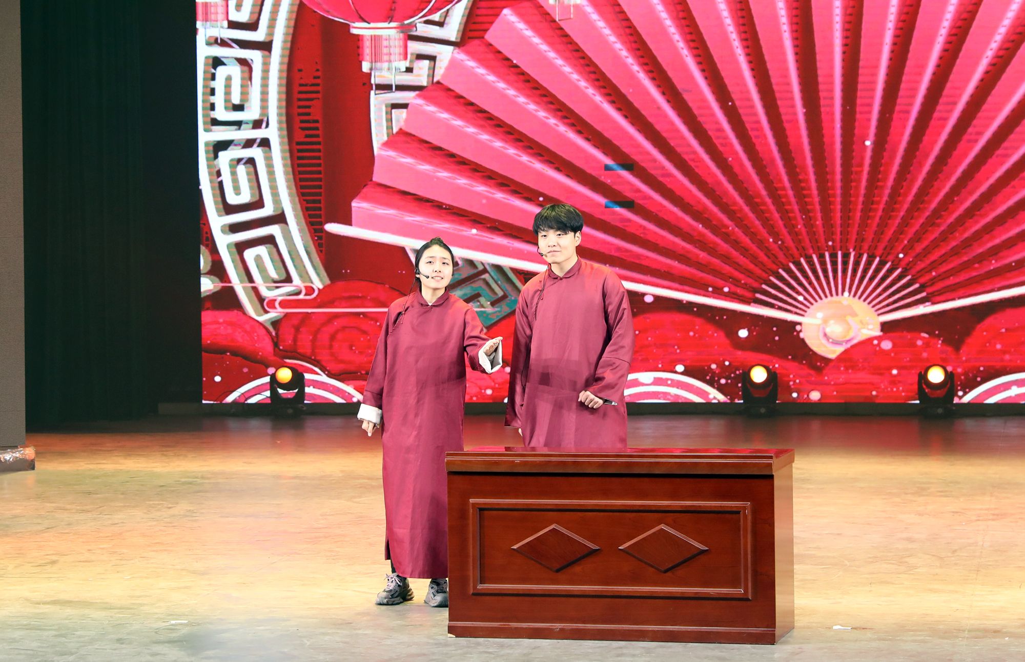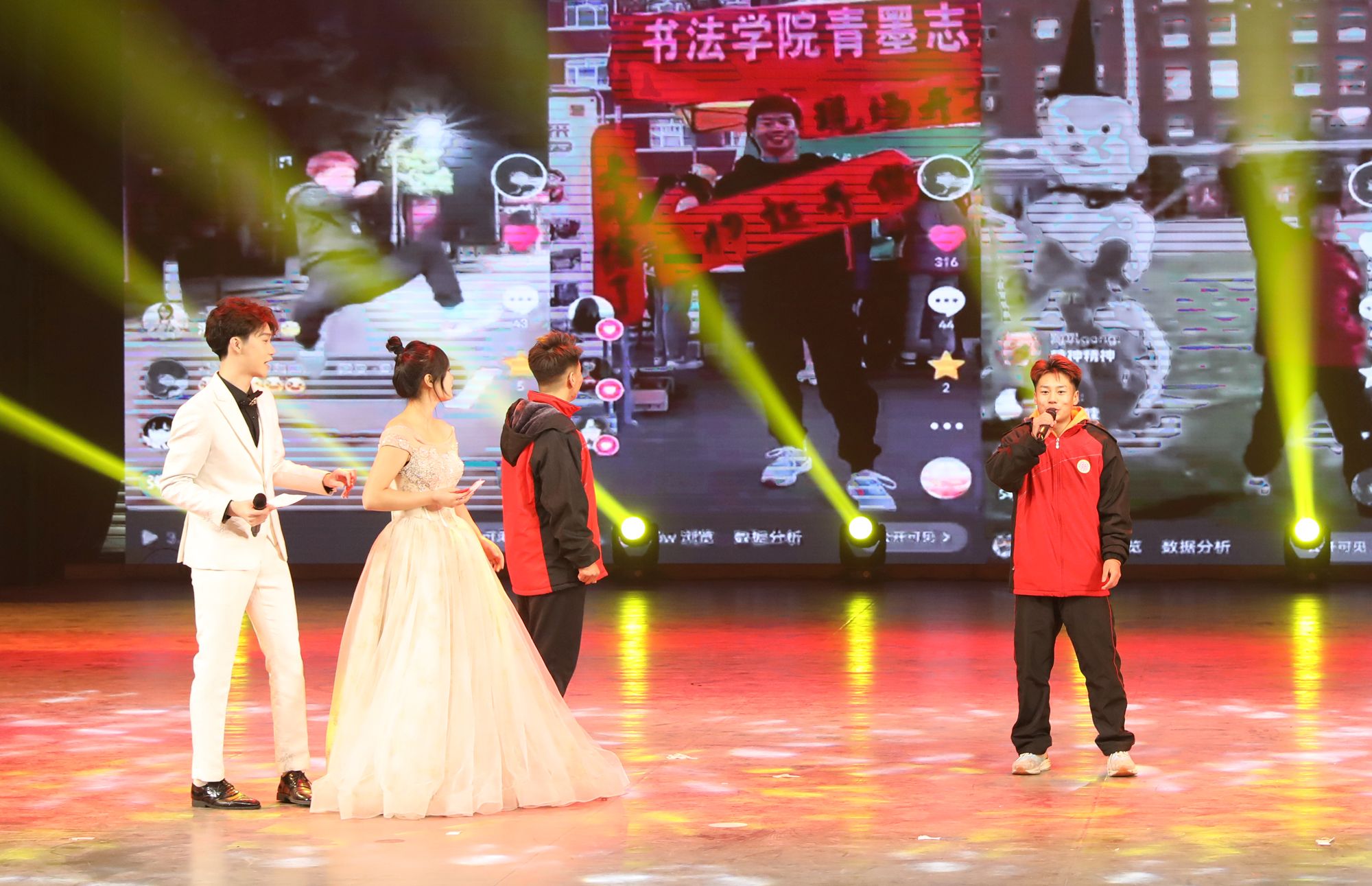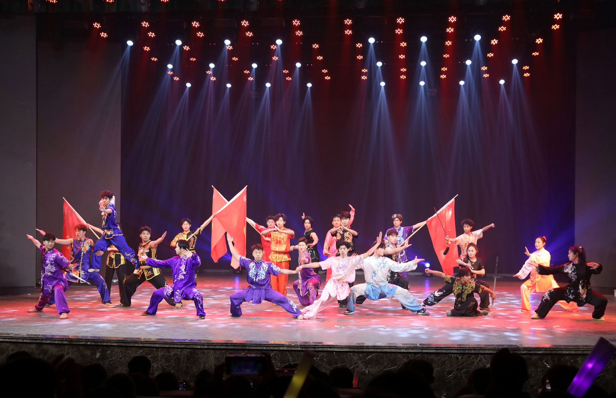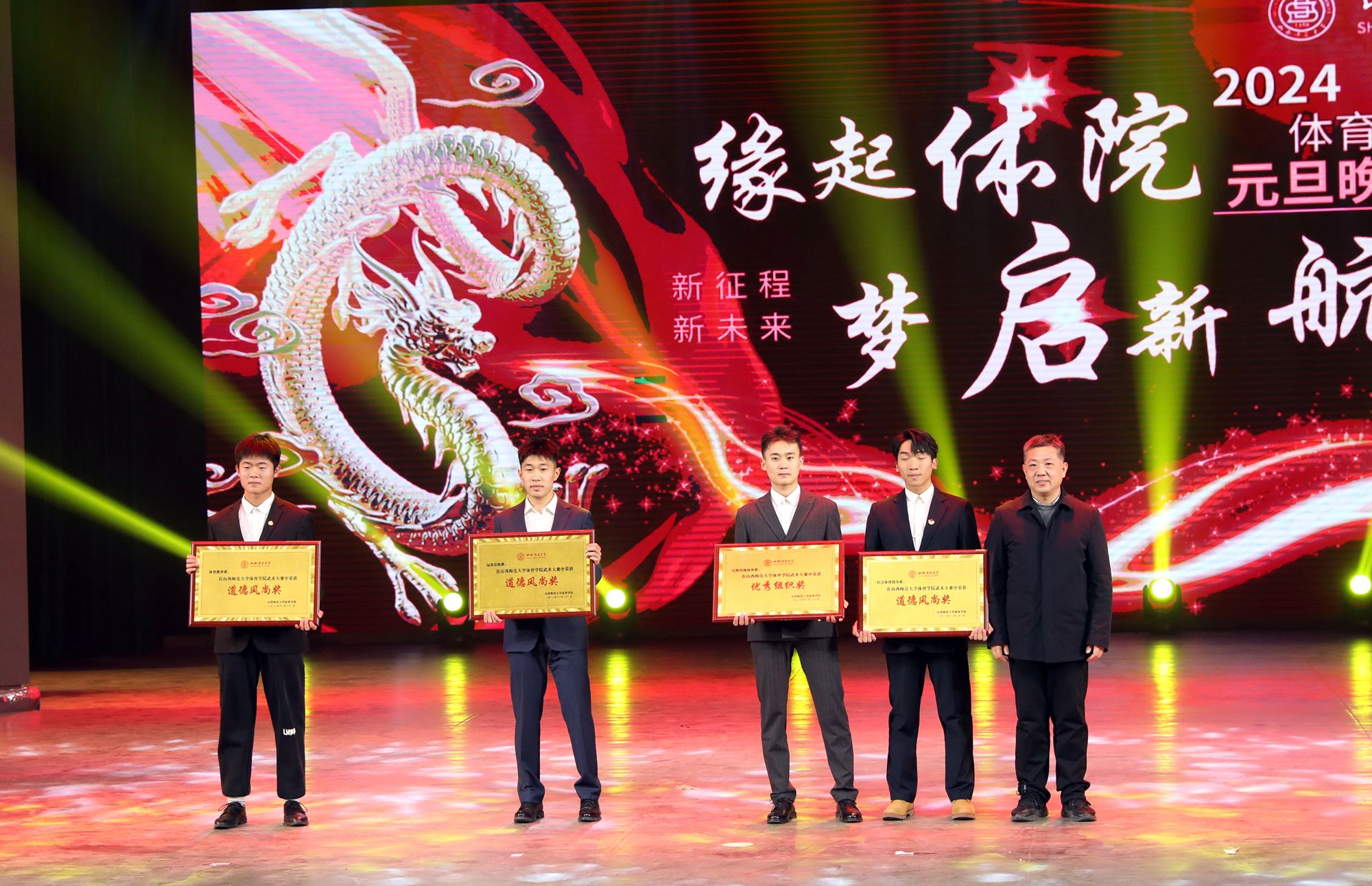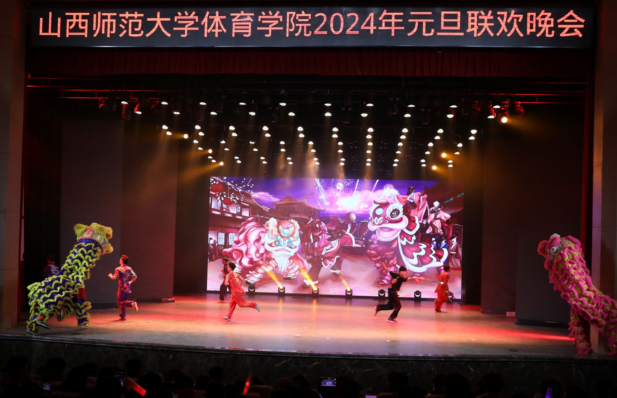 铿锵有力的音乐和传统的舞狮文化开场,使每一位观众都融入其中。民族传统体育系同学们为大家带来武术表演《武动乾坤》,他们紧致的肌肉线条和优美的武术动作被展示的淋漓尽致。兄弟公司节奏感非常强的舞蹈《Queen card》展示出了他们青春的活力。哑春乐队和任磊老师为大家带来了一首充满了摇滚气息的歌曲《离开地球表面》,点燃了全场观众的热情。女老师们也在闲暇之余为大家准备了一个有趣又优雅的舞蹈《舞动青春》,大家伙纷纷为她们加油喝彩。民族传统体育系同学们的武术表演《红色追忆》,歌颂了长征途中为祖国赴汤蹈火、前仆后继的英雄。体教2303班的同学们在小品《药方》中通过夸张的神态,不断反转的剧情,引起了台下观众的惊喜连连,也让大家感受到了他们沉甸甸的爱国之心。最后,同学们在《相亲相爱》的大合唱中将元旦晚会推向高潮。与会人员在合影留念中圆满落下帷幕。