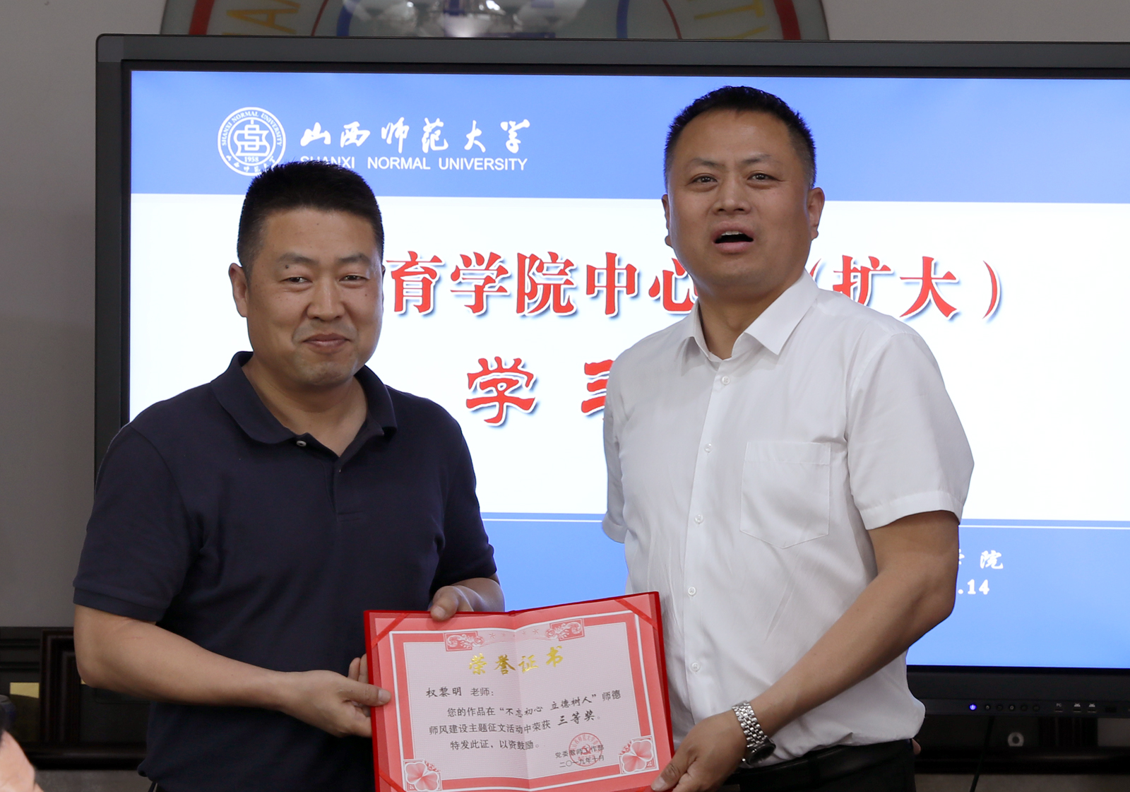 最后,许书记还通报了公司权黎明副教授、吴宣廷老师、卫玲玲老师、侯亚丽老师在公司组织的“不忘初心、立德树人”征文活动中的获奖情况,号召大家要向他们学习,积极参加公司、公司组织的活动,取得更大的成果,获得更好的成绩。(院办/文 邓碾管/摄影)