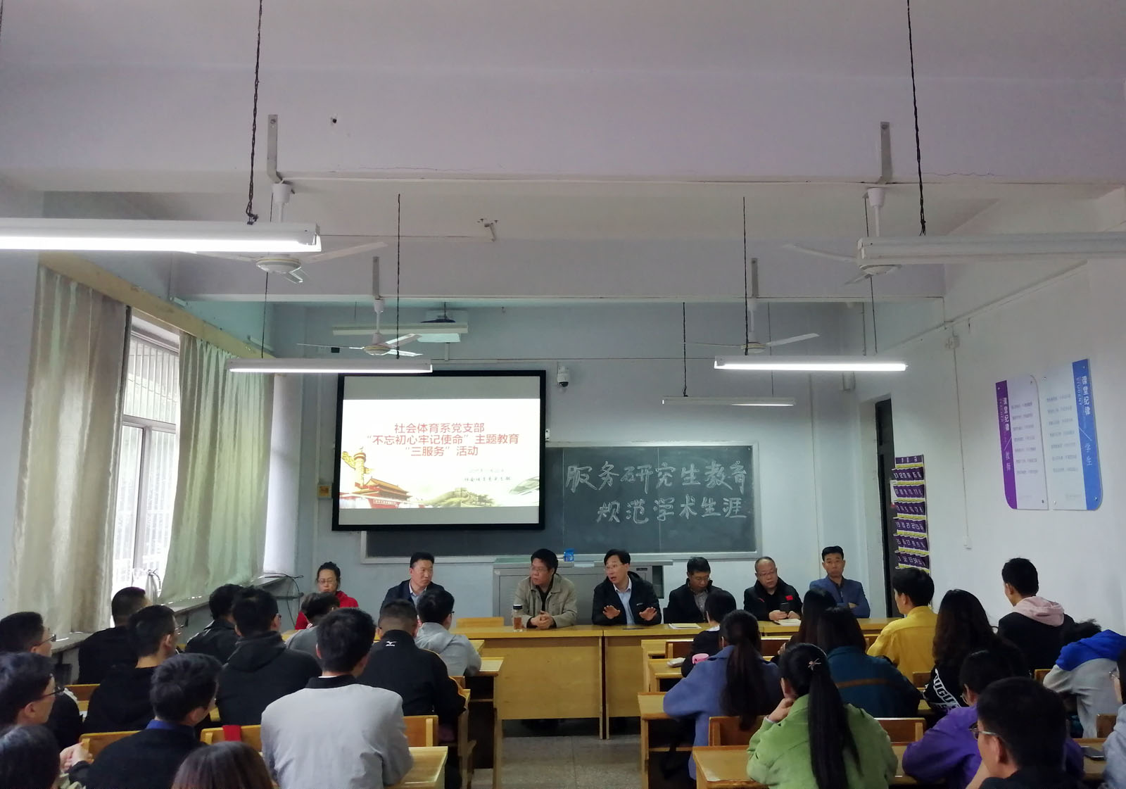 为加强太阳集团tcy8722“不忘初心、牢记使命”主题教育深入开展,社会体育系党支部于10月25日星期五在太阳集团tcy8722教学楼六教室开展“不忘初心、牢记使命”主题教育“三服务”活动。“三服务活动”,目的是服务地方、服务基层、服务群众,为身边的群众做实事好事。本次活动围绕“服务研究生教育,规范学术生涯”,和2019级体育学学术研究生们讨论交流学习心得,答疑解惑,合理规划研究生生活。