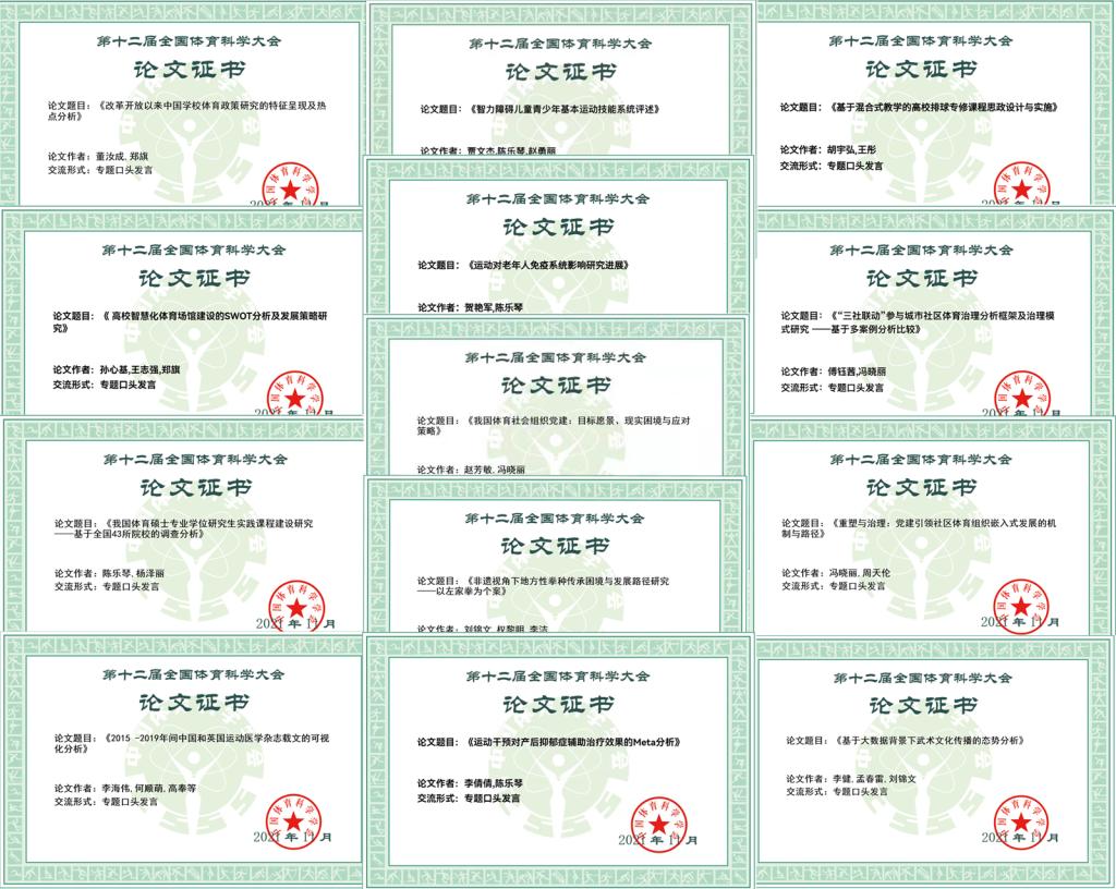 公司太阳集团tcy8722共有76篇论文入选,创历史新高。其中入选专题口头报告32篇,入选墙报交流44篇,论文录取第一作者单位排名统计全国第19位;26日上午,受大会邀请,经理郑旗教授线上主持“体育服务业发展研究”专题报告。