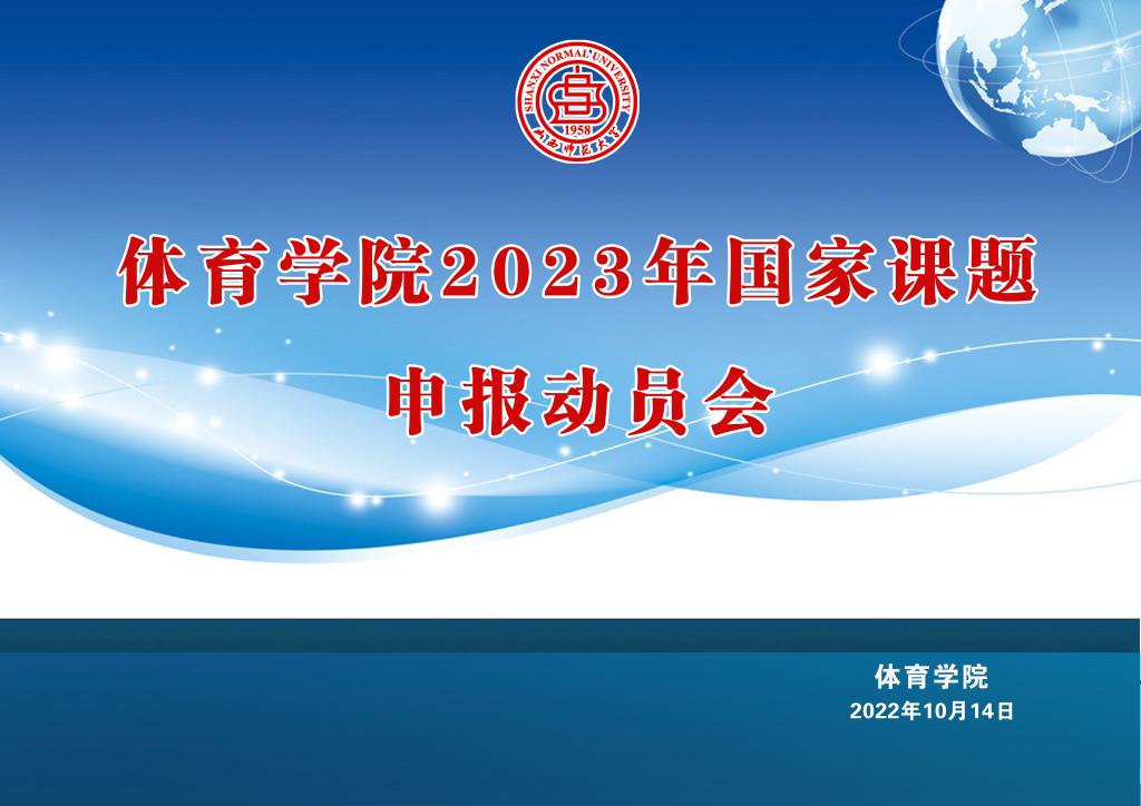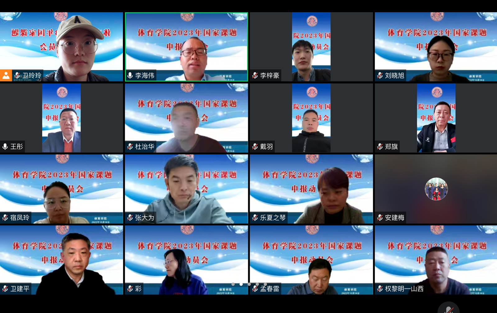 10月14日下午,太阳集团tcy87222023年国家基金项目申报动员会以腾讯会议的形式召开。院领导、系部负责人、研究生导师、具备申报资格的教师及科研秘书参会。社科处处长王彤、科技处处长安建梅在线出席并作动员讲话和指导,会议由副经理李海伟主持。