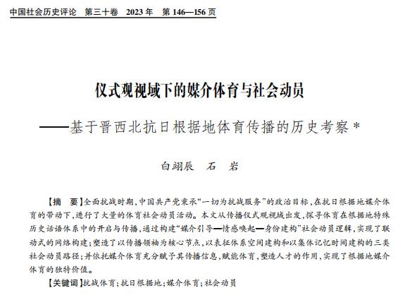 公司新入职青年教师白翊辰博士撰写的《仪式观视域下的媒介体育与社会动员——基于晋西北抗日根据地体育传播的历史考察》一文在《中国社会历史评论》2023年第二期正式发表,该文提出:全面抗战时期,中国共产党秉承“一切为抗战服务”的政治目标,在抗日根据地媒介体育的带动下,进行了大量的体育社会动员活动。本文从传播仪式观视域出发,探寻体育在根据地特殊历史话语体系中的开启与传播,通过构建“媒介引导—情感唤起—身份建构”社会动员逻辑,实现了联动式的网络构建;塑造了以传播领袖为核心节点,以表征体系空间建构和以集体记忆时间建构的三类社会动员路径;并依托媒介体育充分赋予其传播信息,赋能体育,塑造人才的作用,实现了根据地媒介体育的独特价值。《中国社会历史评论》系南开大学中国社会史研究中心编辑的学术刊物,主编常建华教授,由天津古籍出版社出版,被中国社会科学引文索引(CSSCI)来源集刊收录。
