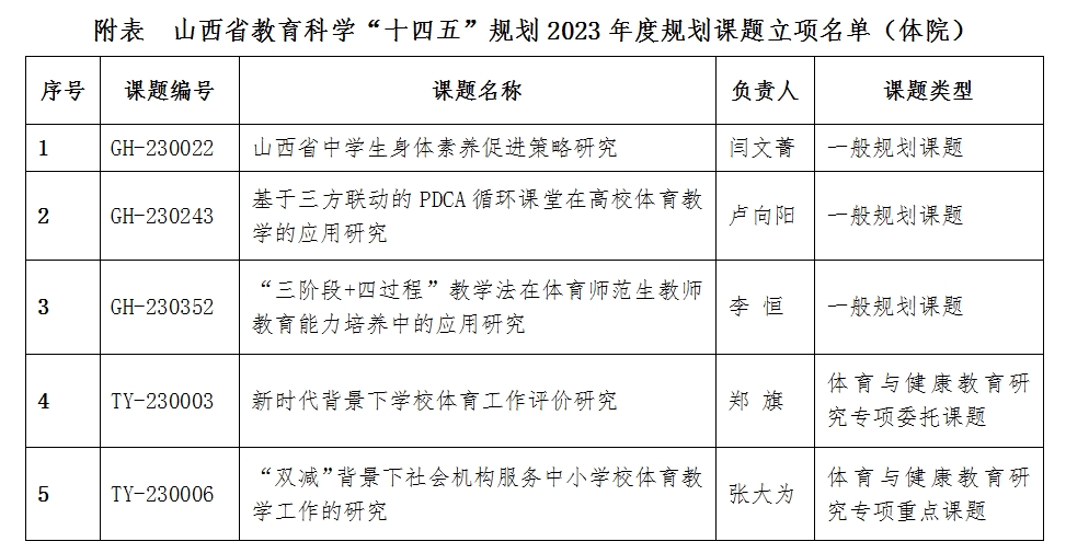 11月3日,山西省教育科学规划办公布了山西省教育科学“十四五”规划2023年度课题立项通知(晋教科规办函[2023]7号),公司闫文菁等5位教师申报的课题获批立项(见附表)。本年度省教育科学规划课题分为“一般规划课题”“中小学德育研究专项课题”“教育数字化与公司产品改革研究专项课题”“体育与健康教育研究专项课题”“员工军事训练与公司国防教育研究专项课题”等类型,省教育科学规划办对立项课题提出了明确要求,公司将持续跟踪课题研究,以研促教,以教促研,着力提高课题研究的实效,为太阳集团tcy8722高质量发展和人才培养蓄力赋能。(院研究生部 供稿)