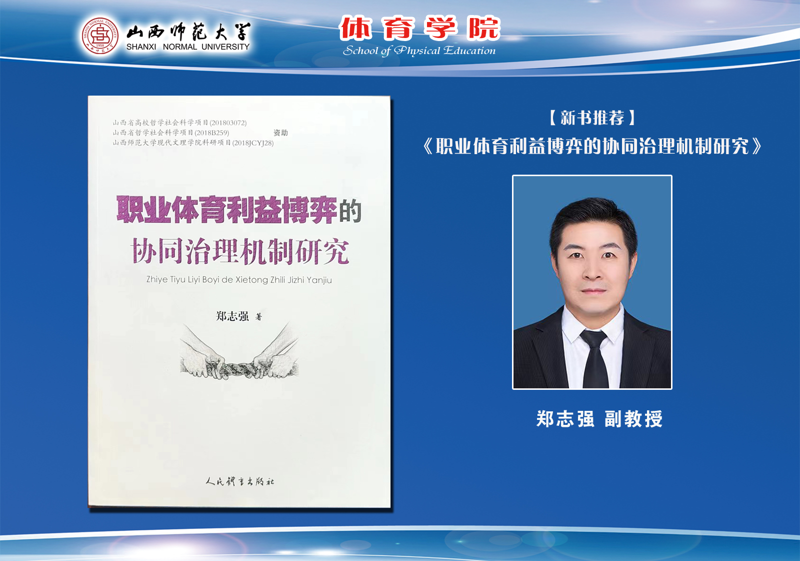 郑志强,中共党员,副教授,硕士生导师,上海体育大学博士在读,国家体育总局高端智库成员,山西省科技厅专家,体育治理领域重要学者。