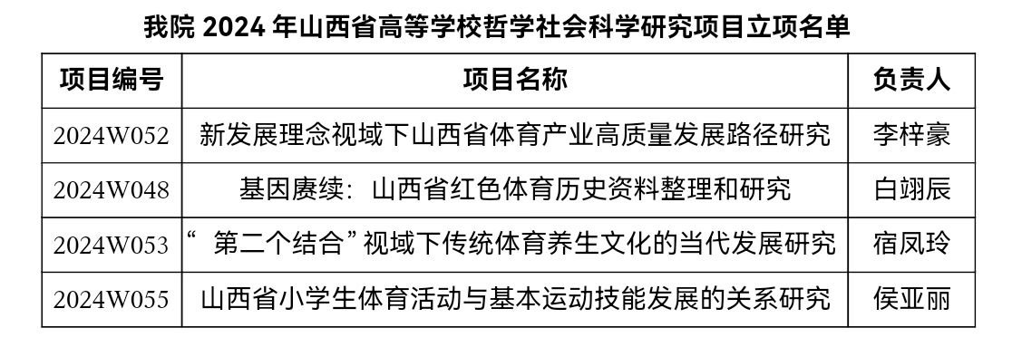 近日,山西省教育厅公布了2024年度山西省高等公司科技创新各类项目立项名单,公司共有4项研究项目成功获批。此次获批的研究项目聚焦于体育产业高质量发展、红色体育历史、体育养生文化、体育活动与运动技能关系领域,深度契合了当前体育领域多元化、高质量发展的时代需求。