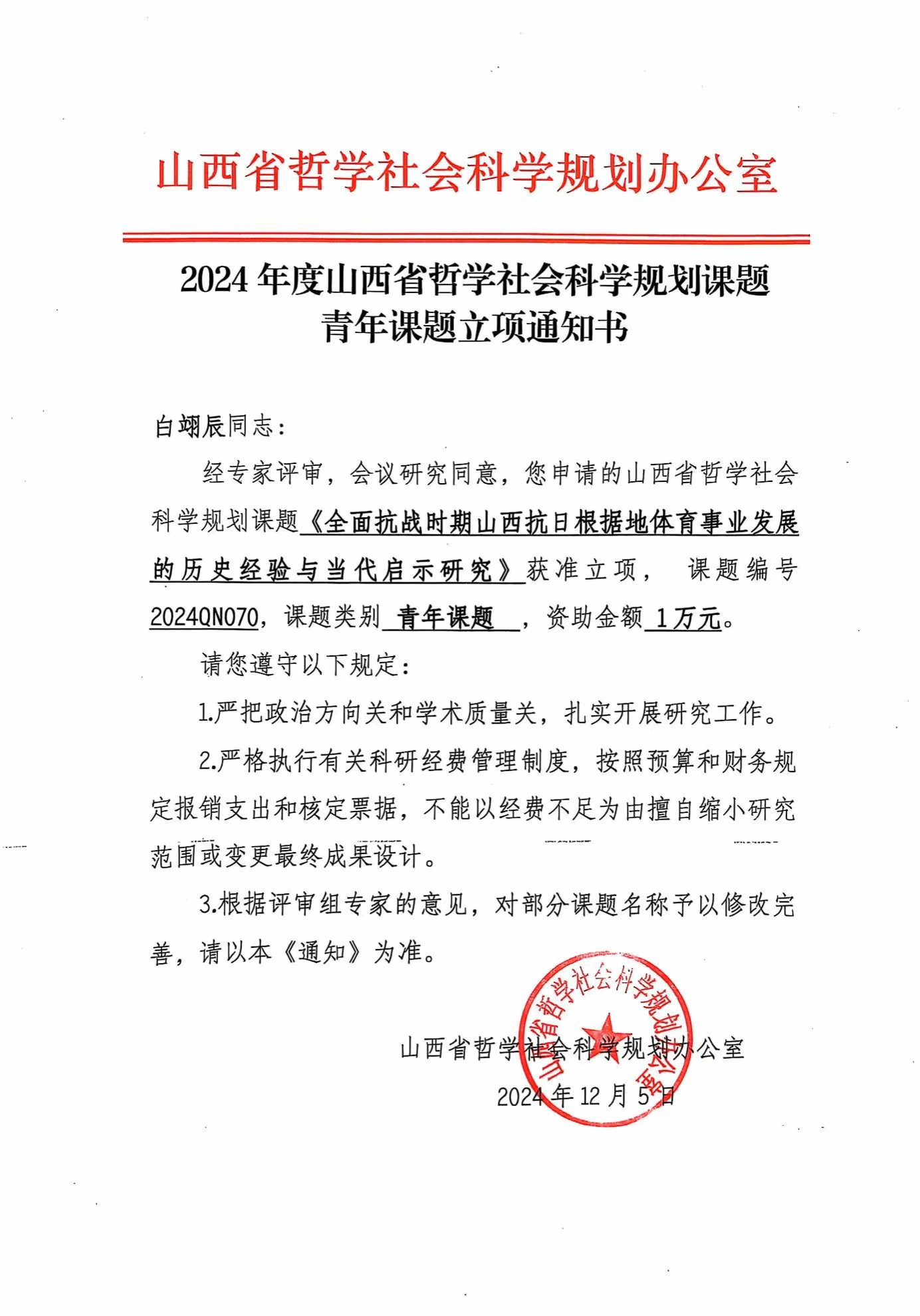 根据山西省哲学社至公室公示的2024年度山西省哲学社会科学规划课题立项名单,经专家评审、会议研究等程序,公司白翊辰博士申报的“全面抗战时期山西抗日根据地体育事业发展的历史经验与当代启示研究”获得青年项目立项公示,项目编号:2024QN070。