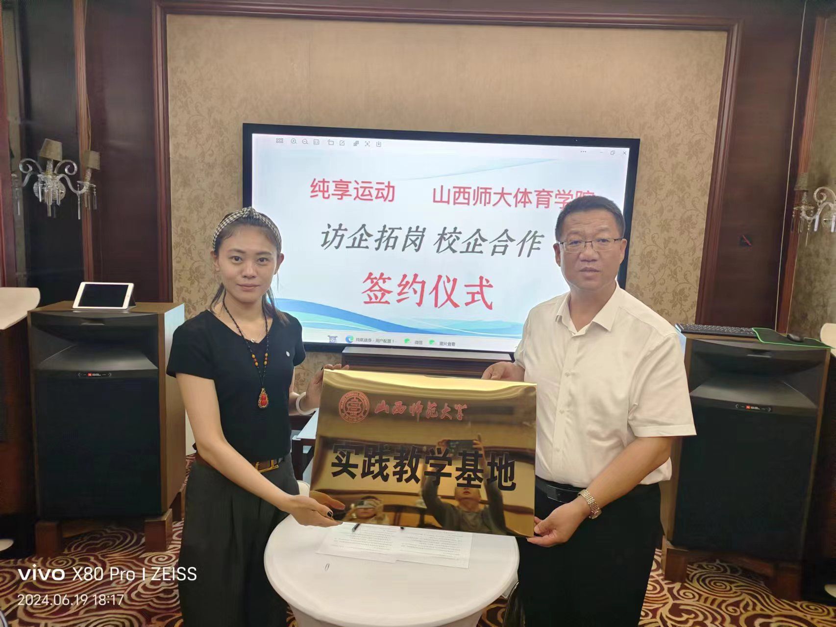 在太原市星河湾体育中心,王彤经理与“纯享体育”负责人进行了座谈,企业负责人介绍了企业理念、运营机制、现有规模及发展规划。随后参观考察了健身场馆。公司领导对企业场馆优质设施及发展规模给予了高度评价,并结合公司培养人才的优势与企业进行了深度洽谈。随后,双方进行了签约与授牌仪式。